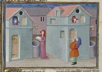 Parigi, Bibliothèque de l'Arsenal, 5070, f. 252r. Il copista del manoscritto è Guillebert de Mets. Ghita, rimasta chiusa fuori casa, getta una pietra nel pozzo; Tofano viene a sua volta chiuso fuori casa dalla moglie.