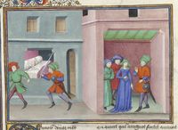 Parigi, Bibliothèque de l'Arsenal, 5070, f. 263v. Il copista del manoscritto è Guillebert de Mets. Arriguccio insegue Ruberto fuori la camera da letto dove dorme la moglie; la moglie di Arriguccio accusa il marito davanti ai suoi fratelli.