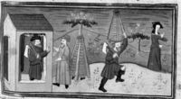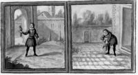 Parigi, Bibliothèque Nationale de France, Fr. 12421, f. 273r. Giovanni del Bragoniera e Biagio Pizzini rubano a fra' Cipolla la reliquia dell'Arcangelo Gabriele (erroneamente rappresentata come un uccello); il frate segna con una croce le vesti dei paesani utilizzando dei carboni, che egli spaccia per reliquie del martirio di San Lorenzo.