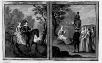 Parigi, Bibliothèque Nationale de France, Fr. 12421, f. 258r. Madonna Oretta accetta il passaggio e la compagnia di un cavaliere; annoiata dall'uomo, Oretta scende dal cavallo e si ricongiunge ai suoi amici.