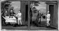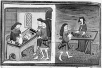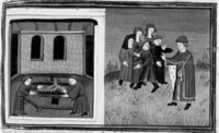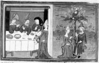 Parigi, Bibliothèque Nationale de France, Fr. 12421, f. 259r. Cisti fornaio offre del vino a Geri Spina ed i suoi ospiti seduti a tavola; un servitore inviato da Geri si reca da Cisti con un fiasco per chiedergli del vino.