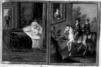 Parigi, Bibliothèque Nationale de France, Fr. 12421, f. 299v. Il cavaliere Lambertuccio scappa dalla camera di Isabella con la spada sguainata, spaventando il marito; l'uomo, recatosi in camera della moglie, vi trova il suo amante Lionetto.