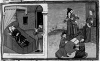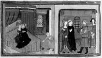 Parigi, Bibliothèque Nationale de France, Fr. 12421, f. 331v. Monna Piccarda visita il parroco di Fiesole per invitarlo nella sua casa; il parroco viene sorpreso dal vescovo e dai fratelli di Piccarda mentre giace a letto con la serva.