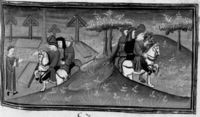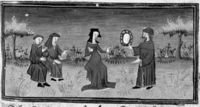 Parigi, Bibliothèque Nationale de France, Fr. 12421, f. 271r. Betto Brunelleschi e la sua brigata si fermano a conversare con Guido Cavalcanti al cimitero di San Giovanni; allontanandosi a cavallo, Betto spiega ai suoi amici le parole di Guido.