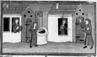 Parigi, Bibliothèque Nationale de France, Fr. 12421, f. 291v. Ghita, rimasta chiusa fuori casa, getta una pietra nel pozzo; Tofano viene a sua volta chiuso fuori casa dalla moglie.