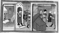 Parigi, Bibliothèque Nationale de France, Fr. 12421, f. 285r. Il marito di Peronella cerca di vendere la botte in cui è nascosto l'amante della donna; Peronella, avendo venduto la botte a Giannello, convince il marito a trasportarla a casa dell'amante.