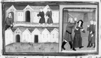 Parigi, Bibliothèque Nationale de France, Fr. 12421, f. 294v. Arimino, travestito da prete, ascolta la confessione della moglie; di notte l'uomo monta la guardia davanti alla porta di casa.
