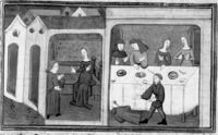 Parigi, Bibliothèque Nationale de France, Fr. 12421, f. 139r. Tedaldo, travestito da pellegrino, spinge monna Ermellina a confessarsi; durante un banchetto Tedaldo rivela la sua vera identità.