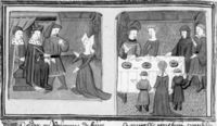 Parigi, Bibliothèque Nationale de France, Fr. 12421, f. 153v. Giletta, in cambio di una cura per il re, chiede in sposo Beltramo di Rossiglione; ad un banchetto Giletta presenta a Beltramo i suoi due figli.