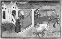 Parigi, Bibliothèque Nationale de France, Fr. 12421, f. 197v. Girolamo muore disteso sul letto accanto a Salvestra e a suo marito; Salvestra partecipa al funerale del giovane insieme ad altre donne, mentre sopraggiunge un uomo.