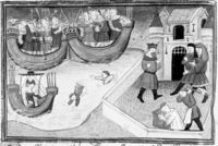 Parigi, Bibliothèque Nationale de France, Fr. 12421, f. 184v. Gerbino abborda la nave della figlia del re di Tunisi, la quale viene abbandonata in mare su una piccola imbarcazione; il re di Tunisi fa decapitare Gerbino.