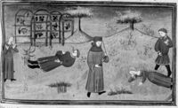 Parigi, Bibliothèque Nationale de France, Fr. 12421, f. 237r. Teodoro viene condotto al luogo del supplizio legato su di un carro, osservato da alcuni uomini affacciati a una finestra.