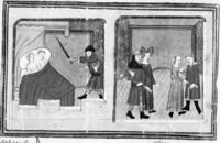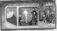 Parigi, Bibliothèque Nationale de France, Fr. 12421, f. 233v. Gianni di Procida e Restituta vengono scoperti a letto insieme dal re Federigo d'Aragona; la seconda scena si svolge incongruamente al centro e dentro la casa, e rappresenta Gianni di Procida condannato al rogo.