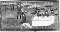 Parigi, Bibliothèque Nationale de France, Fr. 12421, f. 241v. Nastagio degli Onesti invita degli uomini ad un banchetto nel bosco per mostrare loro la visione di un cavaliere con dei cani che aggredisce una fanciulla.
