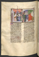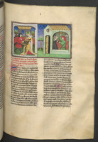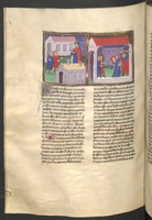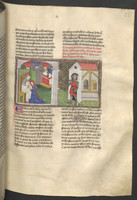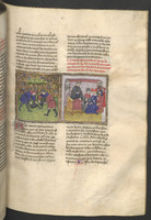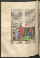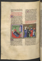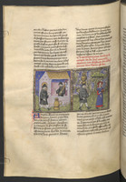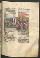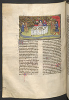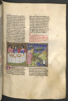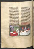 Vienna, Österreichische Nationalbibliothek, 2561, f. 215r. Federigo degli Alberighi mostra a monna Giovanna e un'altra donna il proprio falcone; Federigo serve il falcone come pietanza a Giovanna.