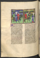 Vienna, Österreichische Nationalbibliothek, 2561, f. 268r. Lidia uccide lo sparviero di suo marito Nicostrato durante un banchetto; Lidia e Nicostrato conversano distesi in un prato, mentre Pirro è nascosto tra i rami di un pero.