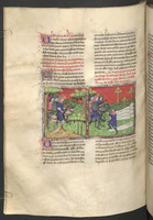 Vienna, Österreichische Nationalbibliothek, 2561, f. 236v. Allontanandosi a cavallo, Betto spiega ai suoi amici le parole di Guido Cavalcanti; Betto Brunelleschi e la sua brigata si fermano a conversare con Guido Cavalcanti al cimitero di San Giovanni.