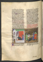 Vienna, Österreichische Nationalbibliothek, 2561, f. 238r. Giovanni del Bragoniera e Biagio Pizzini rubano a fra' Cipolla la reliquia dell'Arcangelo Gabriele; il frate segna con una croce le vesti dei paesani utilizzando dei carboni, che egli spaccia per reliquie del martirio di San Lorenzo.