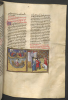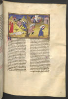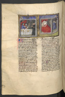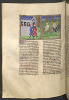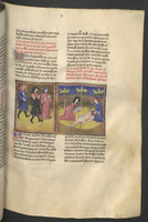 Vienna, Österreichische Nationalbibliothek, 2561, f. 127r. Tedaldo, travestito da pellegrino, spinge monna Ermellina a confessarsi; durante un banchetto Tedaldo rivela la sua vera identità.