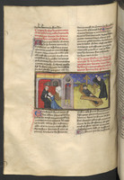 Vienna, Österreichische Nationalbibliothek, 2561, f. 151v. Ghismonda giace con Guiscardo, spiata dal padre Tancredi attraverso una porta; Tancredi consegna alla figlia il cuore dell'amato in una coppa.