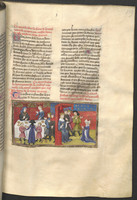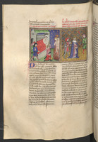 Vienna, Österreichische Nationalbibliothek, 2561, f. 139r. Giletta presenta a Beltramo di Rossiglione i suoi due figli durante un banchetto; Giletta, in cambio di una cura per il re, chiede in sposo Beltramo.