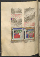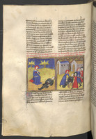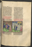 Vienna, Österreichische Nationalbibliothek, 2561, f. 174r. Simona piange sul corpo di Pasquino, avvelenato dalla salvia; per dimostrare la propria innocenza, Simona muore anch'essa avvelenata di fronte al giudice.