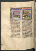 Vienna, Österreichische Nationalbibliothek, 2561, f. 208v. Tre armeni, tra cui il padre di Teodoro, sono affacciati alle finestre di una locanda; Teodoro viene condotto al luogo del supplizio legato su di un carro.