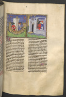 Vienna, Österreichische Nationalbibliothek, 2561, f. 205v. Gianni di Procida e Restituta vengono scoperti a letto insieme dal re Federigo d'Aragona, quindi vengono condannati al rogo; re Federigo viene scortato da un alabardiere.