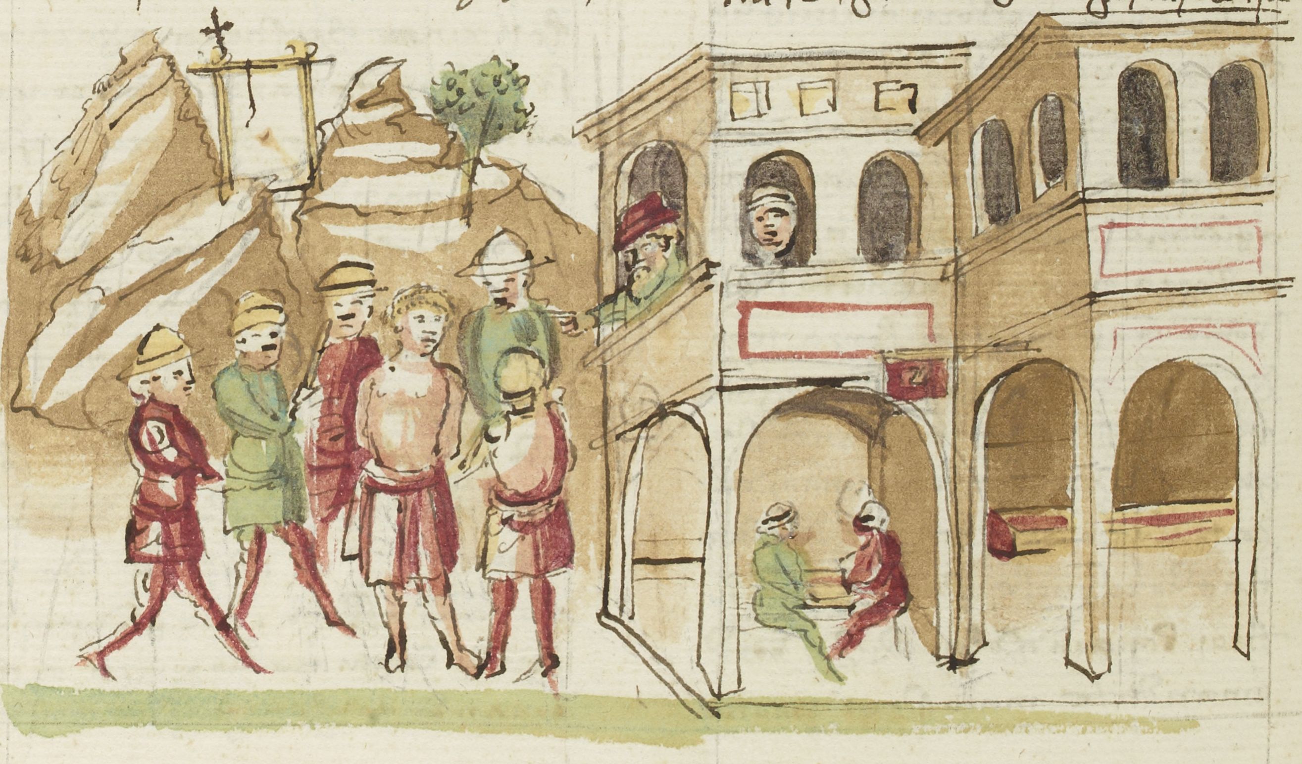 Parigi, Bibliothèque Nationale de France, It. 63, f. 183v. Il copista del manoscritto, datato 10 ottobre 1427, è Ludovico di Salvestro Ceffini. Il padre di Teodoro interviene dalla finestra del palazzo per impedire che il figlio venga condotto alla forca.