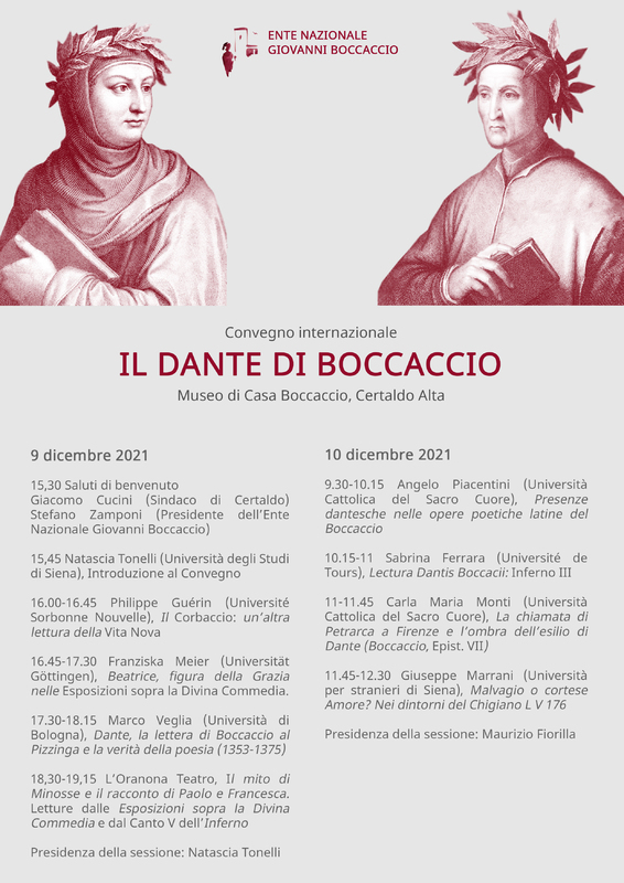Nell’anno centenario dantesco l’Ente Nazionale Giovanni Boccaccio intende dar vita a una riflessione sull’importanza e sul valore della presenza delle opere e del modello dantesco nel suo primo grande cultore, biografo e interprete, Giovanni Boccaccio. Nei giorni 9-10 dicembre 2021, presso Casa Boccaccio a Certaldo, studiosi di Dante e di Boccaccio dialogheranno sulla funzione di Boccaccio per la ricezione dell'opera dantesca; sul suo ruolo di intermediario nei confronti di Petrarca; sulla presenza della parola dantesca nelle opere di Boccaccio, sia in latino che in volgare, con particolare attenzione alle questioni della lingua, dei metri e dei generi.