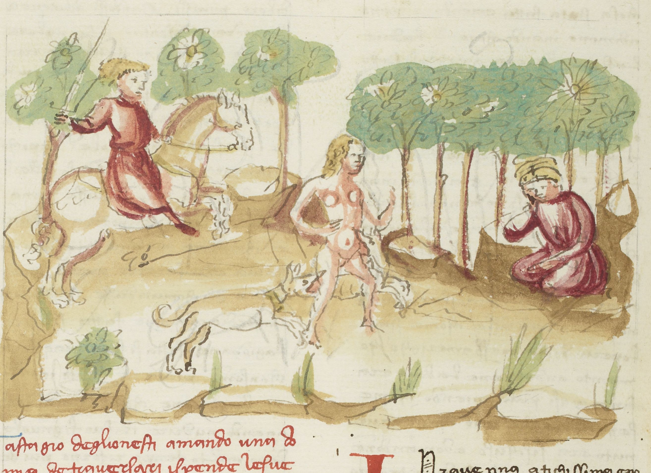 Parigi, Bibliothèque Nationale de France, It. 63, f. 186v. Il copista del manoscritto, datato 10 ottobre 1427, è Ludovico di Salvestro Ceffini. Nastagio degli Onesti nel bosco ha la visione di una donna aggredita da una muta di cani e inseguita da un cavaliere.