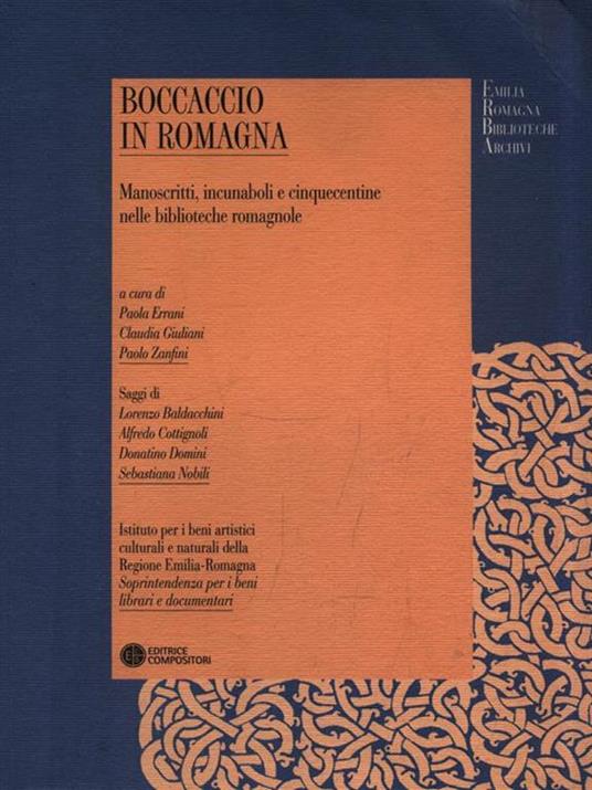 Due prestigiose biblioteche storiche - la Malatestiana di Cesena e la Classense di Ravenna - ricordano il VII centenario della nascita di Giovanni Boccaccio tramite una mostra che presenta gli esiti di un'accurata ricognizione nelle biblioteche romagnole delle sue opere manoscritte e stampate nei secoli XV e XVI. L'intento dei curatori - Paola Errani, Claudia Giuliani e Paolo Zanfini - è quello di delineare una mappa utile per esplorare e approfondire il complesso capitolo della fortuna di Boccaccio nella terra che lo vide ospite presso le piccole corti dei Polenta a Ravenna e degli Ordelaffi a Forlì (il primo soggiorno fra 1345 e 1347, l'ultimo nell'inverno 1361-1362), fortuna che si tradusse in circolazione libraria e traduzione figurativa della sua produzione letteraria. Ai contributi iniziali, di Donatino Domini, Alfredo Cottignoli, Sebastiana Nobili, Lorenzo Baldacchini, che mostrano la fecondità dell'intreccio degli approcci filologico e bibliografico, segue il catalogo - che comprende la descrizione di dieci manoscritti, sei incunaboli e sessantanove edizioni del XVI secolo, corredata dell'analisi sistematica degli esemplari - a 'raccontare' l'insieme dei libri posseduti da sedici biblioteche, presenti nelle tre province romagnole, e dalla Biblioteca di Stato di San Marino.