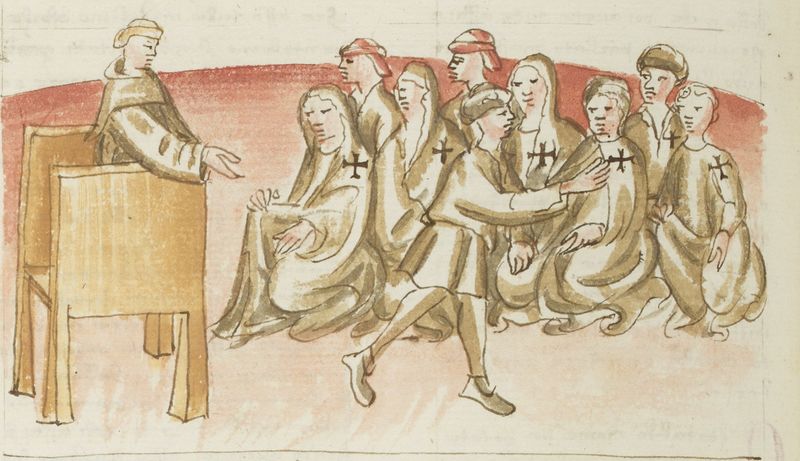 Parigi, Bibliothèque Nationale de France, It. 63, f. 205v. Il copista del manoscritto, datato 10 ottobre 1427, è Ludovico di Salvestro Ceffini. Fra' Cipolla predica ai certaldesi dal pulpito, quindi segna le vesti dei paesani con i carboni.