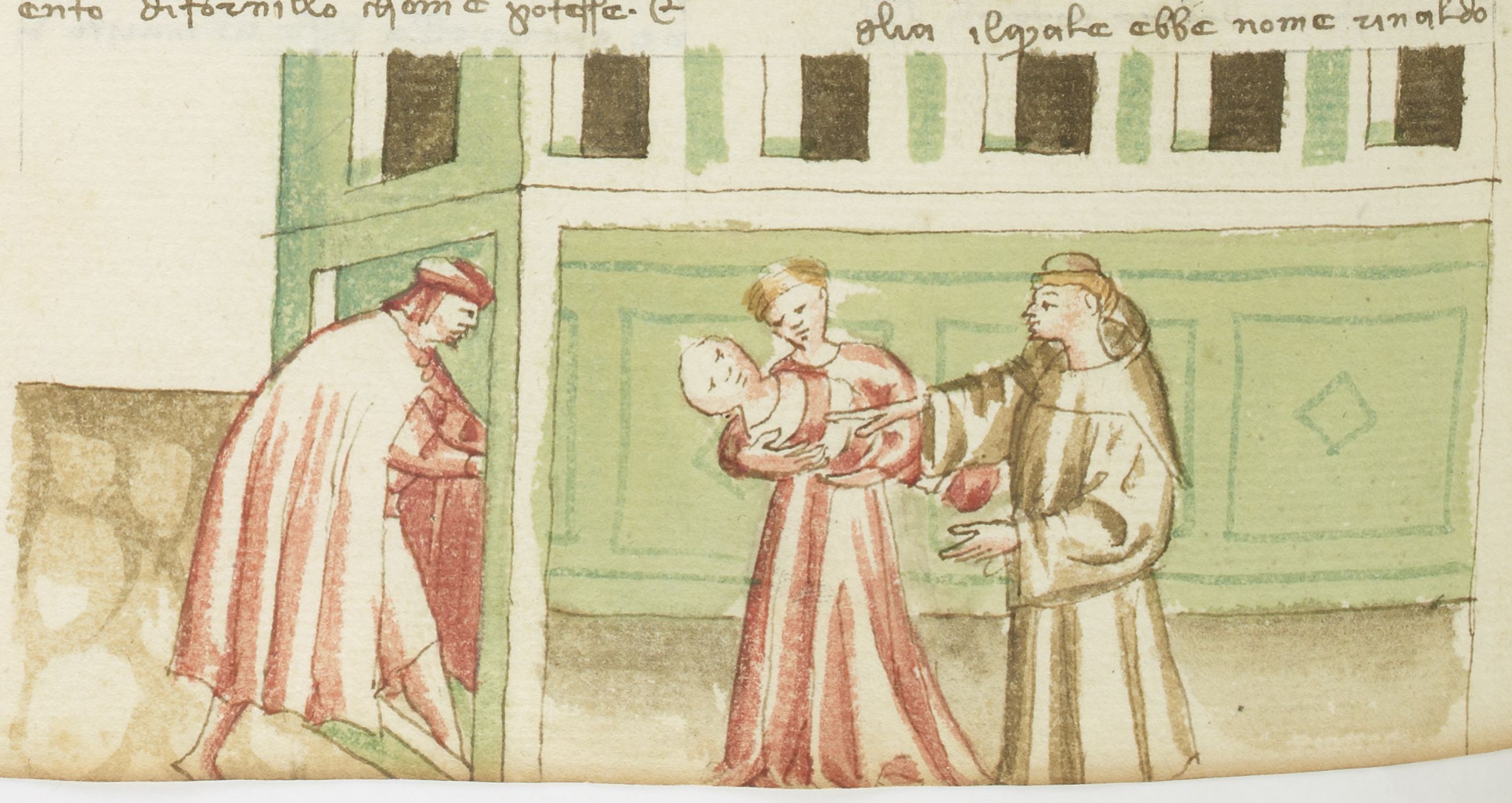 Miniatore fiorentino (1427-1430), Frate Rinaldo finge di guarire il figlio di donna Agnesa mentre sopraggiunge il marito di lei
