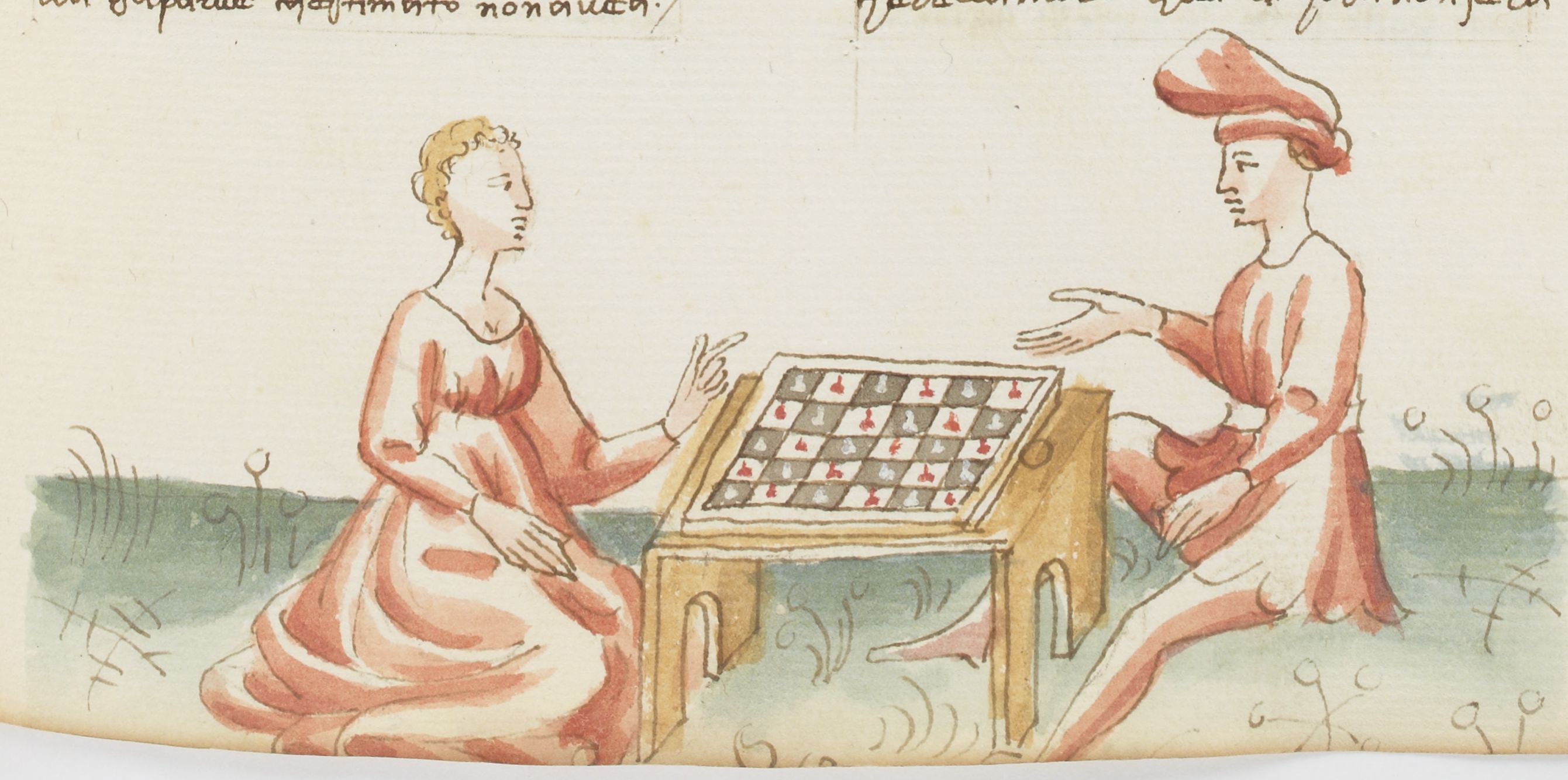 Parigi, Bibliothèque Nationale de France, It. 63, f. 221r. Il copista del manoscritto, datato 10 ottobre 1427, è Ludovico di Salvestro Ceffini. Beatrice e Lodovico giocano a scacchi in giardino.
