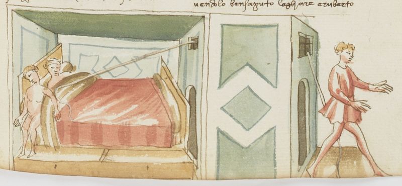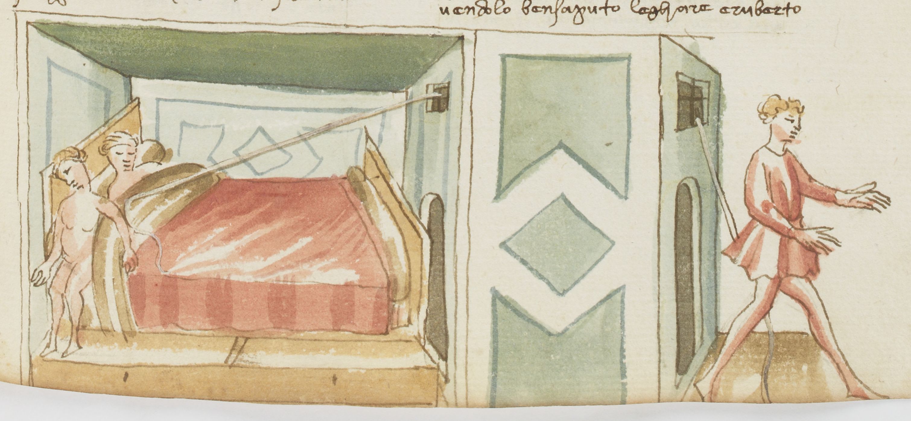 Parigi, Bibliothèque Nationale de France, It. 63, f. 223r. Il copista del manoscritto, datato 10 ottobre 1427, è Ludovico di Salvestro Ceffini. Tirando il filo di spago, Ruberto sveglia Arriguccio invece della moglie, quindi si dà alla fuga.