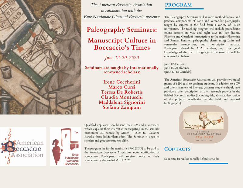 The program fee for the seminar is $700 (USD) to be paid to the American Boccaccio association upon notification of acceptance. Participants will receive notice of their acceptance by the end of March 2023.