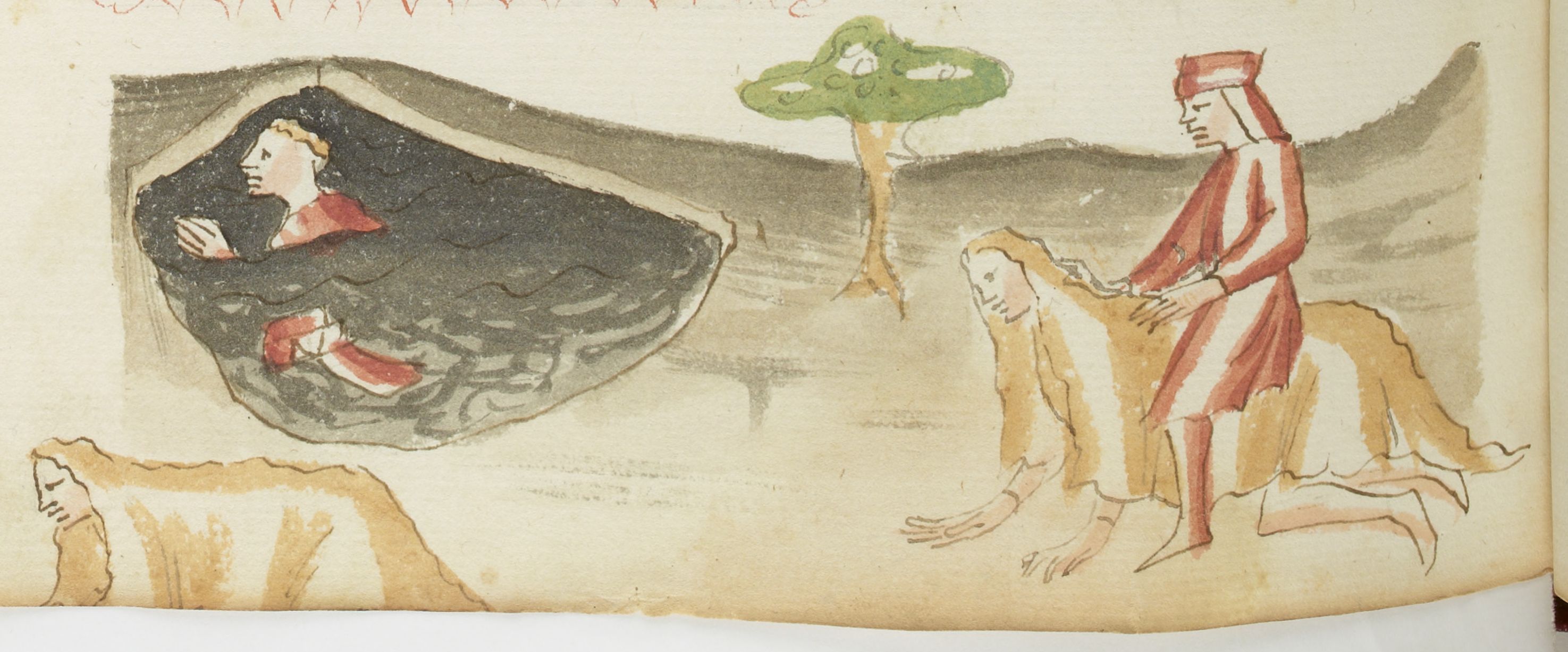 Parigi, Bibliothèque Nationale de France, It. 63, f. 250v. Il copista del manoscritto, datato 10 ottobre 1427, è Ludovico di Salvestro Ceffini. Buffalmacco, vestito con una pelliccia e chinatosi a quattro zampe, fa salire Simone sul suo dorso; poco dopo Buffalmacco getta il medico in una fossa fetida.