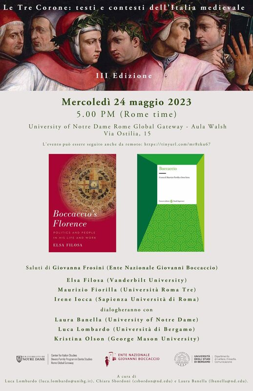 Saranno presenti Giovanna Frosini (Presidente dell'Ente Nazionale Giovanni Boccaccio), Laura Banella (University of Notre dame), Kristina Olson (George Mason University) e Chiara Sbordoni (University of Notre Dame).