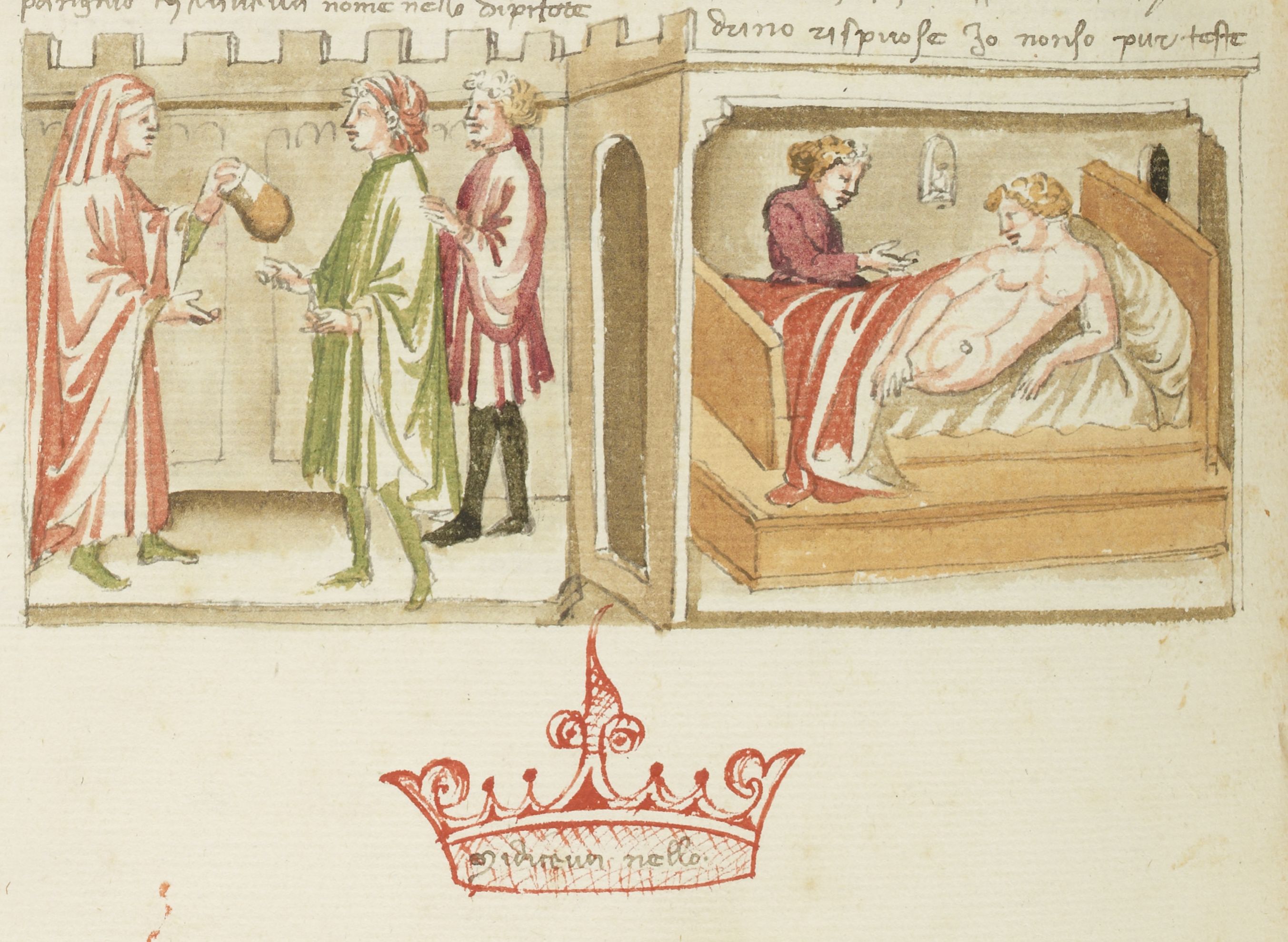 Parigi, Bibliothèque Nationale de France, It. 63, f. 264v. Il copista del manoscritto, datato 10 ottobre 1427, è Ludovico di Salvestro Ceffini. Il medico Simone consegna l'infuso a Calandrino e Bruno; Calandrino giace malato nel letto, credendosi gravido; in basso, una corona in corrispondenza del richiamo "mi diceva nello".