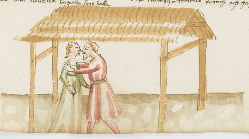 Parigi, Bibliothèque Nationale de France, It. 63, f. 267r. Il copista del manoscritto, datato 10 ottobre 1427, è Ludovico di Salvestro Ceffini. Calandrino abbraccia Niccolosa in un granaio.