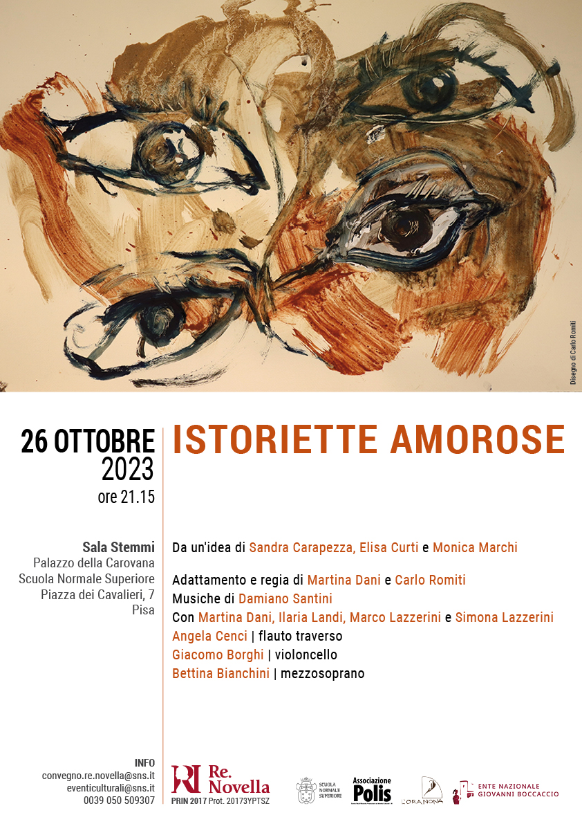 «Umana cosa è aver compassione degli afflitti»: così si apre il «Decameron», la più celebre raccolta di novelle della letteratura italiana. La narrazione e l’ascolto sono le azioni che da sempre contraddistinguono l’essere umano e che gli consentono di imparare, attraverso la parola dilettevole, e di distinguere il lecito dall’illecito, il bene dal male, l’azione fatta contro «ragione» da quella che si oppone alla giustizia. Qual è il sentimento che accomuna uomini e donne e li induce a compiere azioni straordinarie? Cosa c’è di più umano dell’amore? Lo spettacolo Istoriette amorose, nato in collaborazione con Oranona Teatro, nasce come costola di un progetto PRIN-2017 finanziato dal Miur che coinvolge, oltre l’Università degli Studi di Siena anche la Scuola Normale Superiore di Pisa, l’Università Ca’ Foscari di Venezia e l’Università degli Studi di Milano, e ha quale oggetto di ricerca la produzione novellistica del Rinascimento (Re.Novella).