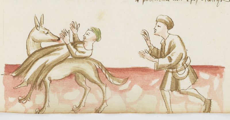 Parigi, Bibliothèque Nationale de France, It. 63, f. 271r. Il copista del manoscritto, datato 10 ottobre 1427, è Ludovico di Salvestro Ceffini. Un pastore soccorre la moglie di Talano aggredita da un lupo.
