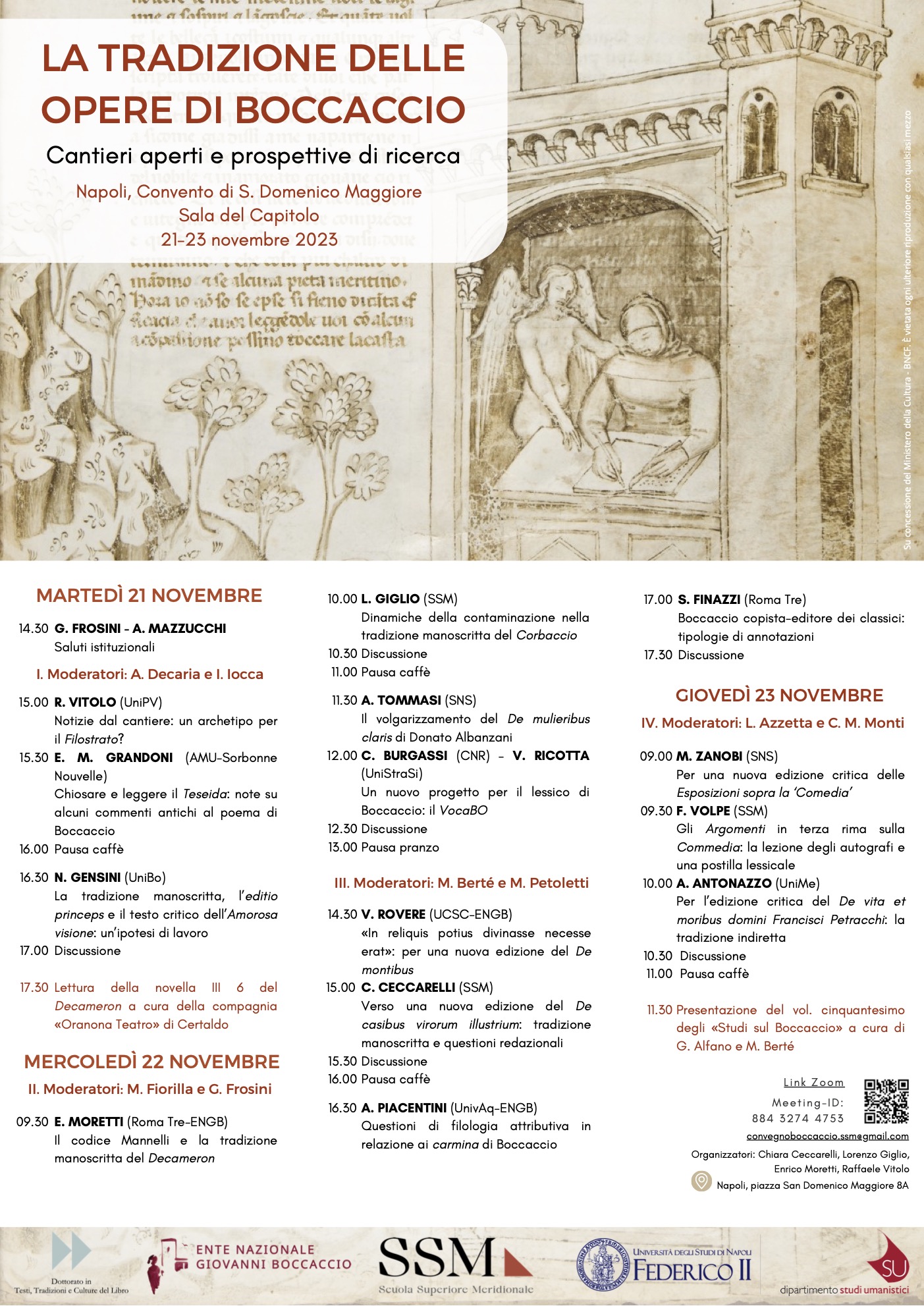 Il Convegno sarà introdotto dalla prof.ssa Giovanna Frosini presidente dell’Ente Nazionale Giovanni Boccaccio e dal prof. Andrea Mazzucchi, direttore del Dipartimento di Studi Umanistici della Federico II e coordinatore del Dottorato di Ricerca in “Testi, tradizioni e culture del libro” della Scuola Superiore Meridionale.