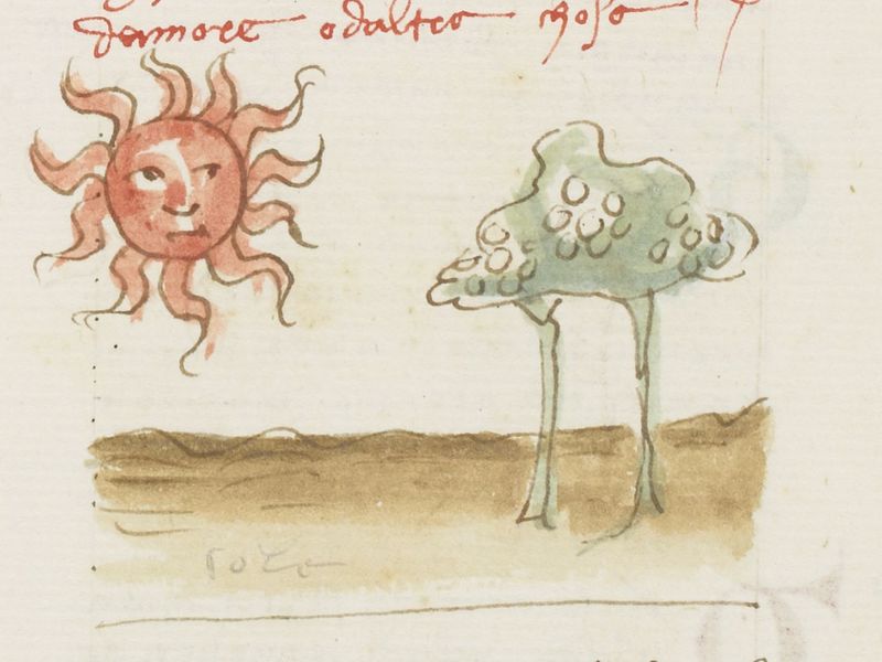 Parigi, Bibliothèque Nationale de France, It. 63, f. 276r. Il copista del manoscritto, datato 10 ottobre 1427, è Ludovico di Salvestro Ceffini. Il sole splende su un paesaggio con due alberi.