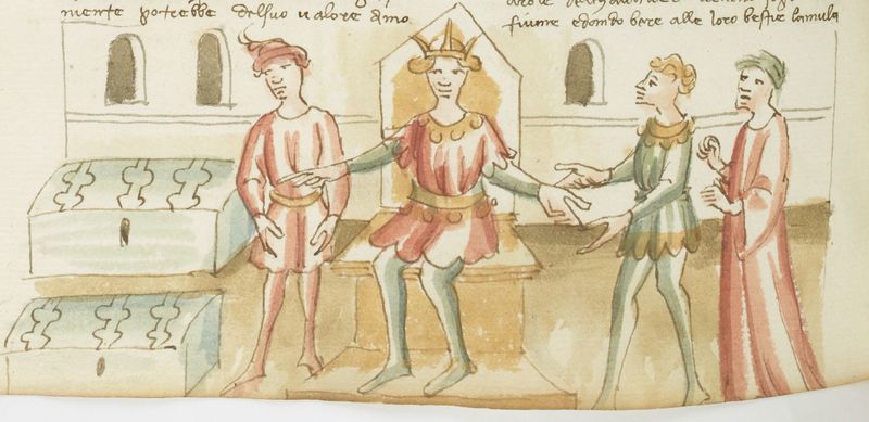 Parigi, Bibliothèque Nationale de France, It. 63, f. 276v. Il copista del manoscritto, datato 10 ottobre 1427, è Ludovico di Salvestro Ceffini. Re Alfonso d'Aragona invita Ruggieri a scegliere tra due forzieri in presenza della corte.
