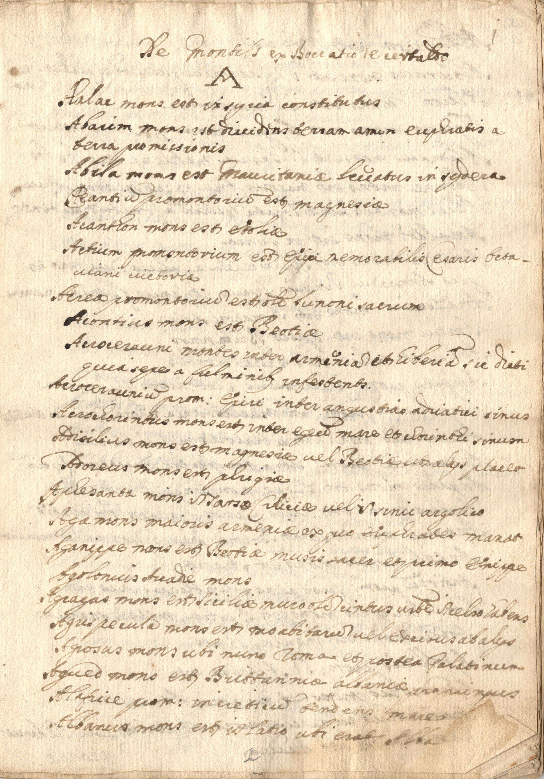 ff. 2r-6v AGOSTINO TINACCI, Excerpta da Boccaccio, De montibus: f. 1r De montibus ex Boccatio de Certaldo inc. A. Aalac mons est in Syria constitutus (il testo si interrompe mutilo alla lettera H).