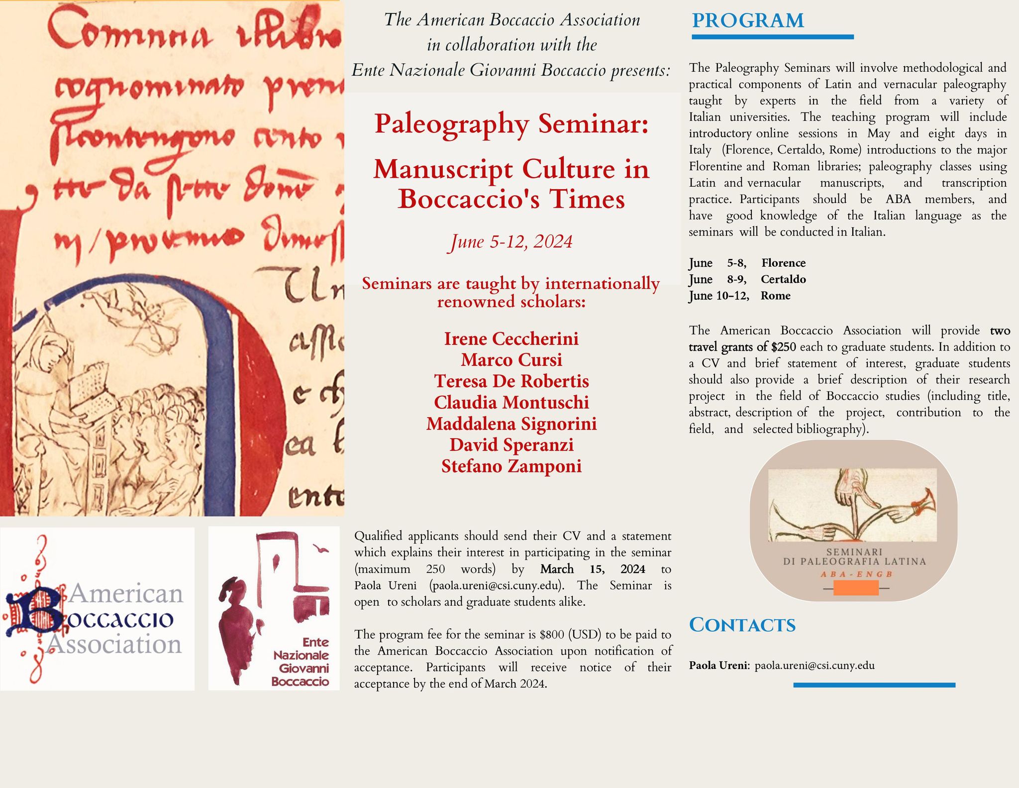 The program fee for the seminar is $800 (USD) to be paid to the American Boccaccio association upon notification of acceptance. Participants will receive notice of their acceptance by the end of March 2024.