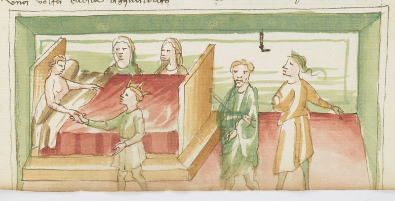 Parigi, Bibliothèque Nationale de France, It. 63, f. 286r. Il copista del manoscritto, datato 10 ottobre 1427, è Ludovico di Salvestro Ceffini. Lisa, inferma nel letto, riceve la visita del re accompagnato da altri personaggi.