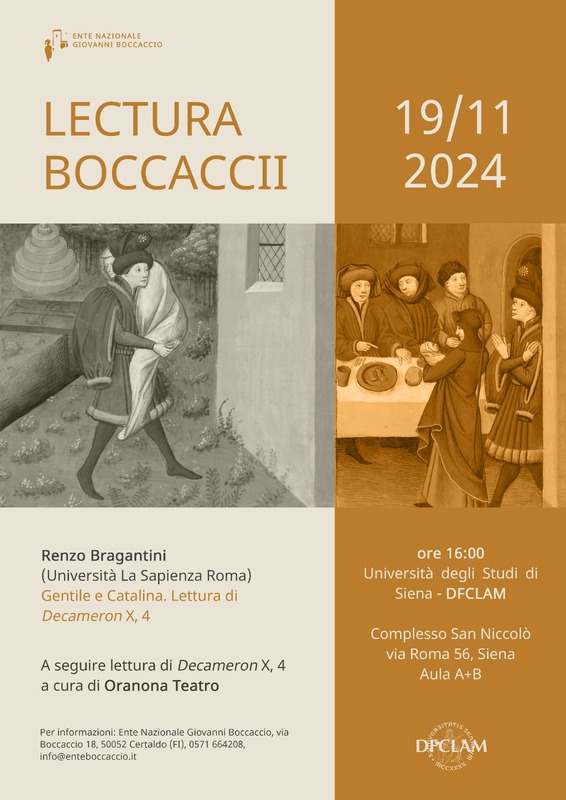 La lettura autunnale dedicata a Boccaccio quest’anno si svolge a Siena, grazie al coordinamento della prof.ssa Natascia Tonelli, delegata dell’Ente alla Lectura, ed è in programma martedì 19 novembre alle 16 al Complesso San Niccolò, via Roma 56, aula A+B, con ingresso libero.